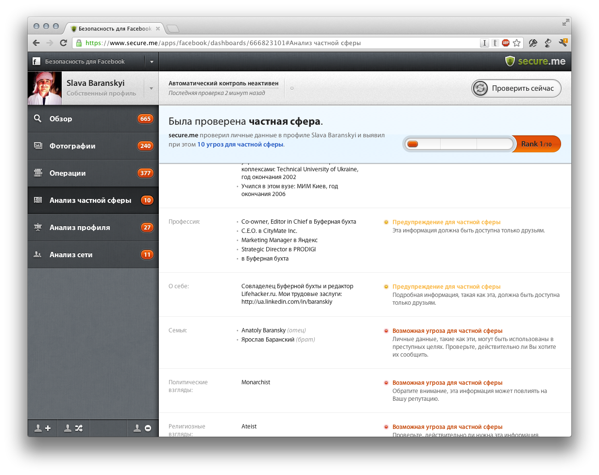Secure.me позволяет сделать профиль в facebook максимально безопасным (+400 инвайтов)